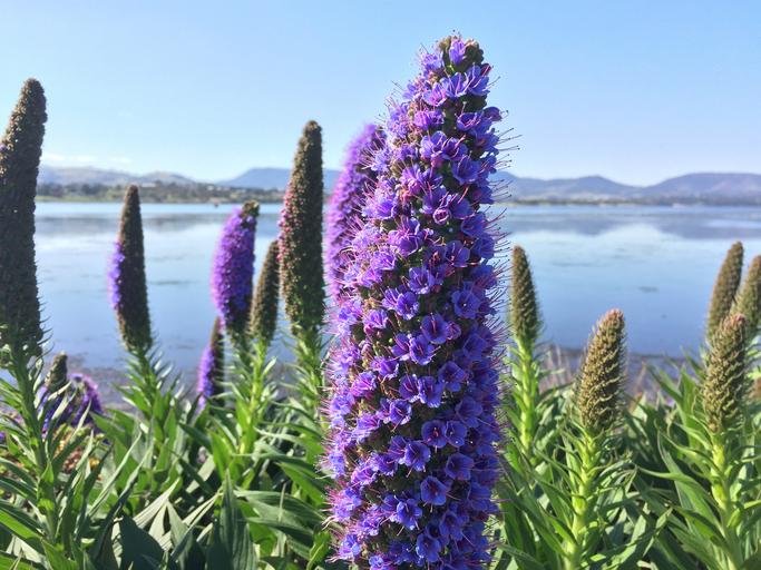 Keywords: flower purple flower green water sunny day sun spring blue sky nature leaf reflection