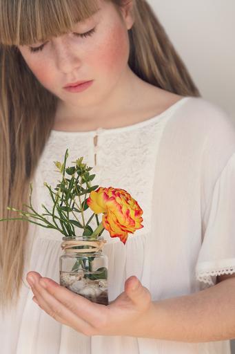 Keywords: flower ranunculus spring flower schnittblume vase glass deco decoration human female girl long hair eyes closed romantic close live attitude to life feelings