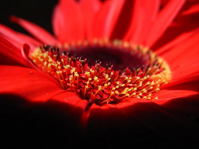 Keywords: flower red petals yellow heart black background flora plant flowers gerberra nature macro green botany plants garden flowering wallpaper