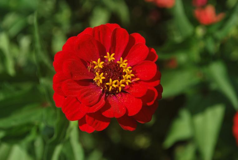 Keywords: flower zinnia red petals blossom blooms blooming green background green leaves flowering plants ornamental close up fleurs pollen yellow