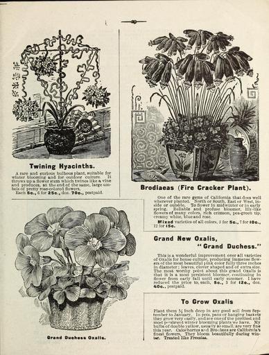 | Keywords: Flowers (15828048084).jpg Twining Hyacinths <br> A rare and curious bulbous plant suitable for <br> winter blooming and for outdoor culture It <br> throws up a flower stem which twines like a vine <br> and produces at the end of the same large um- <br> bels of pretty rose-colored flowers <br> Each 5c 6 for 25c doz 70c postpaid <br> Brodiaeas Fire Cracker Plant <br> One of the rare gems of California that does well <br> wherever planted North or South East or West in- <br> side or outside To flower in midwinter or in early <br> spring Reliable and profuse bloomer lily-like <br> flowers of many colors rich crimson pea-green tip <br> creamy white blue and rose <br> Mixed varieties of all colors 3 for 5c 7 for 10c <br> 12 for 1 5c <br> Grand Duchess Oxalls <br> Grand New Oxalis <br> Grand Duchess <br> This is a wonderful improvement over all varieties <br> of Oxalis for house culture producing immense flow- <br> ers of the most beautiful pink color fully three inches <br> in diameter ; leaves clover shaped and of extra size <br> The most worthy point about this grand Oxalis is <br> that it is a most persistent bloomer continuing in <br> flower from early fall until early summer I have <br> reduced the price to each 5c 3 for 12c doz <br> 40c postpaid <br> To Grow Oxalis <br> Plant them inch deep in any good soil from Sep- <br> tember to January In pots pans or hanging baskets <br> they grow very easily and aie one of the prettiest and <br> most p' -sis'ent winter blooming plants we have My <br> bulbs of double yellow usually so small are very fine <br> this year Caloohortus and Brodeeas are California's <br> finest flowers They bloom beautifully during win- <br> ter Treated like Fxeesias 43800636 148987 77812 Text http //www biodiversitylibrary org/page/43800636 1900 Henry G Gilbert Nursery and Seed Trade Catalog Collection ; Miss Mary E Martin Firm ; Miss Mary E Martin Firm NameFound Caloohortus NameFound Oxalis NameConfirmed Oxalis sect Pseudobulbosae Norlind EOLID 40270 Biodiversity Heritage Library Flowers Christmas Easter midwinter and spring Garden Stories Catalogs Flowers Miss Mary E Martin Firm Nurseries Horticulture Seeds U S Department of Agriculture National Agricultural Library bhl page 43800636 dc identifier http //biodiversitylibrary org/page/43800636 bhlGardenStories Twining hyacinths hyacinths Brodiaeas Fire Cracker Plant Grand Duchess Oxalia Oxalia BHLinbloom miss mary e martin firm nurseries horticulture u s department of agriculture national agricultural library bhlgardenstories fire cracker plant grand duchess oxalia bhlinbloom Information field Flickr posted date ISOdate 2015-02-05 CC-BY-2 0 BioDivLibrary https //flickr com/photos/61021753 N02/15828048084 2015-08-25 00 51 32 cc-by-2 0 PD-old-70-1923 Miss Mary E Martin Firm seed catalog Photos uploaded from Flickr by Fæ using a script |