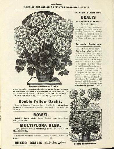 | Keywords: Flowers (15830491983).jpg SPECIAL REDUCTION ON WINTER BLOOMIISG OXAL1S <br> Bermuda Buttercup Oxalis <br> grown plants have produced as high as 70 flower stems <br> atone time and over 1000 flowers in one season It <br> will flower in six weeks 3c each 4 for 10c 12 for 25c <br> Mammoth Bulbs 4e each 3 for 10c 12 for 35c <br> Double Yellow Oxalis <br> New A Beauty Produces large double bright yellow <br> flowers in the greatest profusion 5s each 4 for 15c 12 <br> for 35c <br> BOWEL <br> Bright deep pink Large flowers 3c each 4 for <br> 10c 12 for 25c <br> MULTBFLORA ALBA <br> Large profuse white-flowering sort 3c each 4 for <br> 10c 12 for 25c <br> 2 Bermuda Buttercup 2 Double Yellow 2 Bowei 2 Alba for <br> 25c ˘ <br> WINTER FLOWERING <br> OXALIS <br> Asa BASKET PLANTthis <br> has no equal <br> A class of very interesting <br> and pretty bulbous plants es- <br> pecially adapted fcr winter <br> flowering in hanging baskets <br> pots and window boxes Pet <br> in light soil and keep from <br> frost <br> Bermuda Buttercup <br> one of the finest winter <br> flowering plants for pot <br> culture we have ever seen <br> It is such a strong luxuriant <br> grower that 5 bulbs will be <br> suQcient for a six or eight <br> inch pot Place in a dark and <br> cool position for a few weeks <br> to root thoroughly and remove <br> to a sunny situation in the <br> window or conservatory in <br> a temperature of about 50 de- <br> grees fahr and the great pro- <br> fusion of bloom produced in <br> abundance for weeks will <br> astonish and delight you The <br> flowers are of the purest bright <br> buttercup yellow Well- <br> ffilXED OXALIS mixed 12 frSTa 5 i ' BssbJaVftMowOxalle 43800635 148987 77812 Text http //www biodiversitylibrary org/page/43800635 1900 Henry G Gilbert Nursery and Seed Trade Catalog Collection ; Miss Mary E Martin Firm ; Miss Mary E Martin Firm NameFound Oxalis NameConfirmed Oxalis sect Pseudobulbosae Norlind EOLID 40270 Biodiversity Heritage Library Flowers Christmas Easter midwinter and spring Garden Stories Catalogs Flowers Miss Mary E Martin Firm Nurseries Horticulture Seeds U S Department of Agriculture National Agricultural Library bhl page 43800635 dc identifier http //biodiversitylibrary org/page/43800635 bhlGardenStories Oxalis BHLinbloom miss mary e martin firm nurseries horticulture u s department of agriculture national agricultural library bhlgardenstories bhlinbloom Information field Flickr posted date ISOdate 2015-02-05 CC-BY-2 0 BioDivLibrary https //flickr com/photos/61021753 N02/15830491983 2015-08-25 00 55 49 cc-by-2 0 PD-old-70-1923 Miss Mary E Martin Firm seed catalog Photos uploaded from Flickr by Fæ using a script |