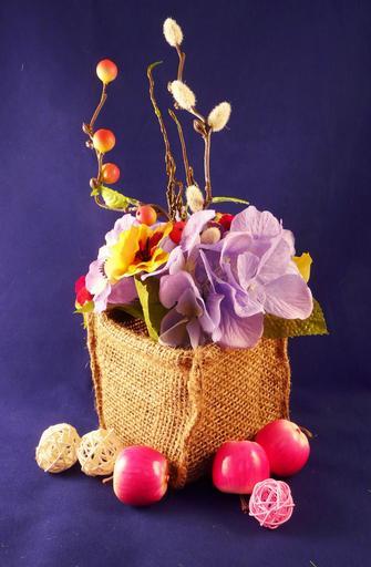 Keywords: flowers baskets blossoms fruits appled red purple blooms plants flowering brown bags arrangements arranged decorative ornamental bunch bouquet romantic fresh blue backgrounds still life decor wedding celebrations gifts