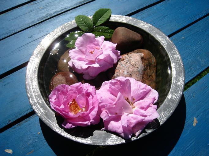 Keywords: flowers bowl arrangement water summer table leaf colors stones