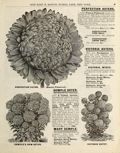 | Keywords: Flowers for springtime (16317176727).jpg  MISS MARY E MARTIN FLORAL PARK NEW YORK <br> PERFECTION ASTERS <br> Called Psony Flowered because the <br> flowers are so large and bright they look <br> like Pseonies The handsomest and most <br> popular standard Aster for plants or cut- <br> ting very large and showy intensely <br> bright also most delicate and soft colors <br> Stems long for cutting <br> Perfection Asters finest mixed 20 to 30 <br> colors <br> Pkt 150 seeds 5c; -oz 15c <br> PERFECTION <br> FIRE BALL <br> Dazzling scarlet Pkt 100 seeds <br> 5c <br> PERFECTION <br> SNOW BALL <br> Pkt 100 seeds 5c <br> VICTORIA ASTERS <br> PERFECTION ASTER <br> SEMPLE'S NEW ASTER <br> Raeony Flowered <br> SEMPLE ASTER <br> The flowers are immense  <br> often 4 inches across  <br> the petals are curiously curved <br> and twisted like a beautiful <br> Japanese Chrysanthemum <br> The colors are superb  soft <br> deep rosy pink fiery <br> lake crimson snow- <br> white and pink Flower <br> stems often 12 inches longr <br> which makes it fine for cut- <br> ting The plant grows 2 feet <br> high and needs plenty of room <br> as it throws up innumerable <br> flower stems Blooms during <br> August and September after <br> most Asters are gone which <br> makes it very valuable for <br> exhibitions and fairs Pkt <br> 100 seeds 5c; Y s -oz 20c <br> MARY SEMPLE <br> The most beautiful of all the <br> varieties Soft deep rosy <br> flesh  a charming color <br> Pkt 100 seeds 6c <br> Semple Snow White <br> Pkt 100 seeds 5c <br> Semple Pink <br> ˘ Pkt 100 seeds 5c <br> This and Perfection have <br> been the most popular Asters <br> grown for years Flowers very <br> large 4 inches and over across <br> Used a great deal by florists for <br> cutting for bouquets vases floral <br> work Colors bright clear charm- <br> ing <br> VICTORIA MIXED <br> Over 30 bright and lovely shades <br> of colors in every packet of my <br> seed <br> Pkt 150 seeds 5c -oz f 15c <br> Victoria Snow White <br> Pkt 100 seeds 5c <br> Victoria Pink <br> Pkt 100 seeds 5c <br> Victoria Scarlet <br> Pkt 100 seeds 5c <br> VICTORIA ASTER 43810143 149144 77948 Page 3 Text http //www biodiversitylibrary org/page/43810143 1900 Henry G Gilbert Nursery and Seed Trade Catalog Collection ; Miss Mary E Martin Firm ; Miss Mary E Martin Firm NameFound Chrysanthemum NameConfirmed Chrysanthemum EOLID 38388 NameBankID 2657422 NameFound Victoria NameConfirmed Victoria EOLID 34123 NameBankID 897688 Biodiversity Heritage Library Flowers for springtime Garden Stories Catalogs Flowers Miss Mary E Martin Firm Nurseries Horticulture Seeds U S Department of Agriculture National Agricultural Library bhl page 43810143 dc identifier http //biodiversitylibrary org/page/43810143 bhlGardenStories Aster BHLinbloom miss mary e martin firm nurseries horticulture u s department of agriculture national agricultural library bhlgardenstories bhlinbloom Information field Flickr posted date ISOdate 2015-02-11 CC-BY-2 0 BioDivLibrary https //flickr com/photos/61021753 N02/16317176727 2015-08-24 23 54 14 cc-by-2 0 PD-old-70-1923 Aster Flowers for springtime Photos uploaded from Flickr by FĂŚ using a script |