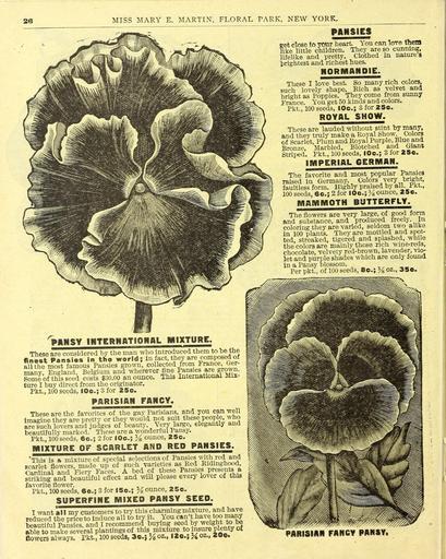 Keywords: Flowers for springtime (16477124646).jpg MARTIN FLORAL PARK NEW YORK <br> PANSIES <br> get close to your heart You can lore then <br> like little children They are so cunning <br> lifelike and pretty Clothed in natures <br> brightest and richest hues <br> NORMANP1E <br> These I lore best So many rich colors <br> such lovely shape Rich as velvet and <br> bright as Poppies They come from sunny <br> France You get 50 kinds and colors <br> Pkt 100 seeds IOc; 3 for 25c <br> ROYAL SHOW <br> These are lauded without stint by many <br> and thev truly make a Royal Show Colors <br> of Scarlet Plum and Royal Purple Blue and <br> Bronze Marbled Blotched and Giant <br> Striped Pkt 100 seeds IOc; 3 for 25c <br> IMPERIAL GERMAN <br> The favorite and most popular Pansies <br> raised in Germany Colors very bright <br> faultless form Highly praised by all Pkt <br> lOOseeds 6c;2for IOc; gOunce 25c <br> MAMMOTH BUTTERFLY <br> The flowers are very large of good form <br> and substance and produced freely In <br> coloring they are varied seldom two alike <br> in 100 plants They are mottled and spot- <br> ted streaked tigered and splashed while <br> the colors are mainly those rich wine-reds <br> chocolate velvety red-brown lavender vio- <br> let and purple shades which are only found <br> in a Pansy blossom <br> Per pkt of 100 seeds 8c; oz 35c <br> PANSY INTERNATIONAL MIXTURE <br> These are considered by the man who introduced them to be the <br> finest Pansies in the world ; in fact they are composed of <br> TlUhe molt famJus Pansies grown collected from France Ger- <br> many England Belgium and wherever fine tansies are grown <br> Some of this seed costs 30 00 an ounce This International Mix- <br> ture I buy direct from the originator <br> Pkt 100 seeds IOc; 3 for 25c <br> PARISIAN FANCY <br> These are the favorites of the gay Parisians and you can well <br> imagine they are pretty or they would not suit these people who <br> are luch lovers and judges of beauty Very large elegantly and <br> beautifullv marked These are a wonderful Pansy <br> Pkt 100 seeds 6c; 2 for IOc; V ounce 25c <br> MIXTURE OF SCARLET AND REP PANSIES <br> 'This is a mixture of special selections of Pansies with red I and <br> scarlet flowers made up of such varieties as Red Ridmghood <br> rardinal and Fierv Faces A bed of these Pansies presents a <br> striking and lS ul effect and will please every lover of this <br> favorite flower _ _ <br> Pkt 100 seeds 6c; 3 for 15c; jounce 25c <br> SUPERFINE MIXED PANSY SEEP <br> I want all my customers to try this charming mixture and have <br> reduced the price to induce all to try it You can't have too many <br> beautiful Pansies and I recommend buying seed by weight to be <br> able to make several planting of this mixture to insure plenty of <br> flowers always Pkt 100 seeds 3c; oz 12c; K oz 20c <br> PARISIAN FANCY PANSY 43810166 149144 77948 Page 26 Text http //www biodiversitylibrary org/page/43810166 1900 Henry G Gilbert Nursery and Seed Trade Catalog Collection ; Miss Mary E Martin Firm ; Miss Mary E Martin Firm Biodiversity Heritage Library Flowers for springtime Garden Stories Catalogs Flowers Miss Mary E Martin Firm Nurseries Horticulture Seeds U S Department of Agriculture National Agricultural Library bhl page 43810166 dc identifier http //biodiversitylibrary org/page/43810166 bhlGardenStories Pansy BHLinbloom miss mary e martin firm nurseries horticulture u s department of agriculture national agricultural library bhlgardenstories bhlinbloom Information field Flickr posted date ISOdate 2015-02-11 CC-BY-2 0 BioDivLibrary https //flickr com/photos/61021753 N02/16477124646 2015-08-24 23 51 51 cc-by-2 0 PD-old-70-1923 Flowers for springtime Photos uploaded from Flickr by Fæ using a script |