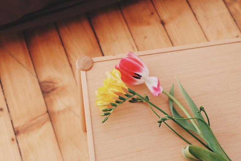 Keywords: flowers natural blossom bloom tulip yellow red table lying wooden floor panels boards cut decorative living home season springtime