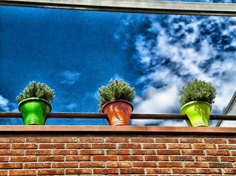 Keywords: flowers plants flower pots building ledge sky clouds outside colorful hdr