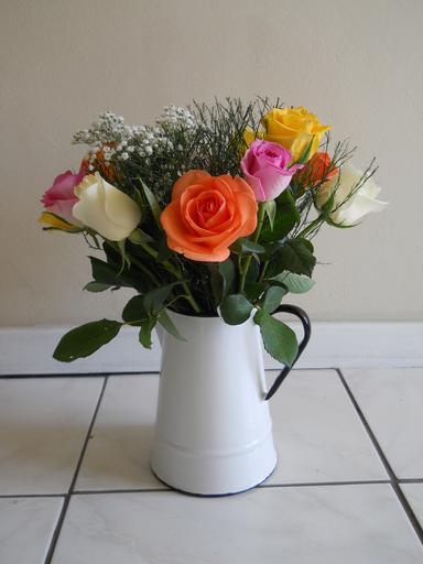 Keywords: flowers pretty roses greenery bouquet jug white floor leaves anniversary