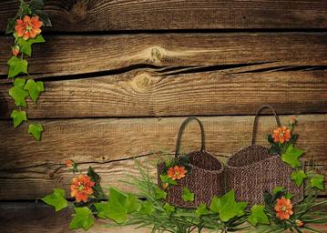 Keywords: flowers rustic baskets leaves autumn decoration thanksgiving orange season fall harvest colorful wood background