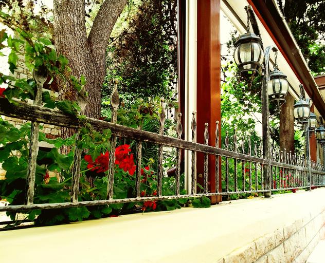 Keywords: flowers window geranium terrace street lights garden outdoor restaurant summer