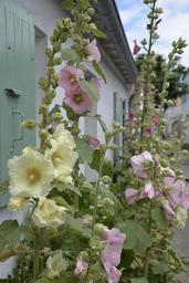 Keywords: flowers yellow hollyhocks pink hollyhocks