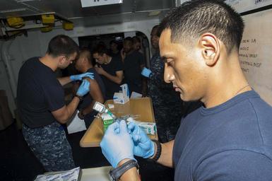 | Keywords: Flu shot 131111-N-VO234-009.jpg en Hospital Corpsman 2nd Class Albert Delacruz fills a syringe with the flu vaccine in the medical department aboard the amphibious assault ship USS Boxer LHD 4 Boxer is the flagship for the Boxer Amphibious Ready Group and with the embarked 13th Marine Expeditionary Unit is deployed in support of maritime security operations and theater security cooperation efforts in the U S 5th Fleet area of responsibility U S Navy photo by Mass Communication Specialist Seaman Conor Minto/RELEASED 2013-11-11 Seaman Conor Minto https //www dvidshub net/image/1144189 131111-N-VO234-009 2013-12-27 07 02 AT SEA PD-USGov-Military-Navy 13th Marine Expeditionary Unit USS Boxer LHD-4 Images from DoD uploaded by Fæ |