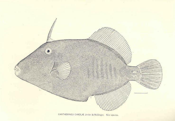 Keywords: FMIB 33308 Cantherines Carolae.jpeg Cantherines Carolae Jordan; McGregor New species Subject Socorro Island Mexico --Fishes Cantherines carolae Geographic Subject Mexico--Socorro Island Tag Fish 1897/1898 Cite book List of Fishes Collected at the Revillagigedo Archipelago and Neighboring Islands Jordan David Starr Washington DC Government Printing Office 1899 Report of the Commissioner United States Commission of Fish and Fisheries 1897/1898 Plate 6 Creator David Starr Jordan PD-UWASH-FMIB Institution University of Washington FMIB-source accession number 33308 Cantherhines dumerilii Drawings of fish by David Starr Jordan Socorro |