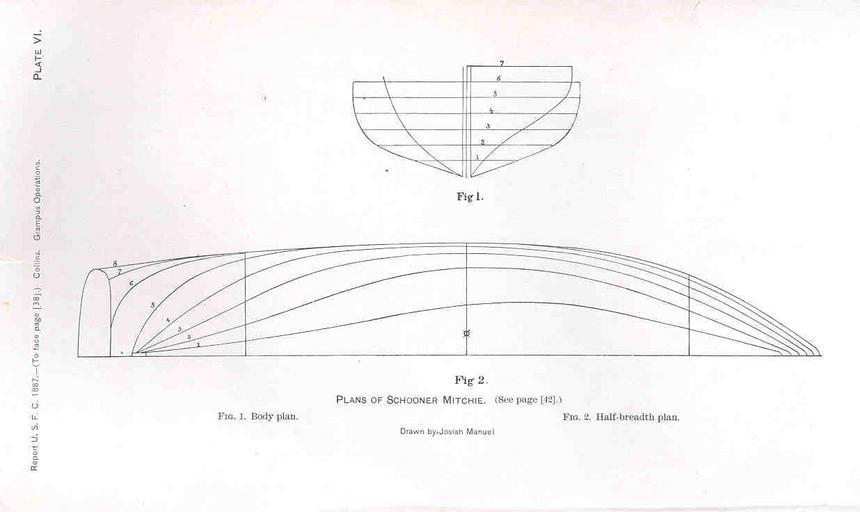| Keywords: FMIB 34012 Plans of Schooner Mitchie.jpeg Plans of Schooner Mitchie Body Plan 1 ;; Half-Breadth Plan 2 Subject Schooners--Design and construction Mitchie Schooner Naval architecture Tag Vessels 1887 Cite book Report Upon the Operations of the U S Fish Commission Schooner Grampus from March 15 1887 to June 30 1888 Report of the Commissioner United States Commission of Fish and Fisheries 1887 Collins J W Washington DC Government Printing Office 1891 Plate VI Josiah Manuel PD-UWASH-FMIB Institution University of Washington FMIB-source accession number 34012 Images from the Freshwater and Marine Image Bank to check Josiah Manuel Mitchie ship Line drawings of ships Naval architecture |
