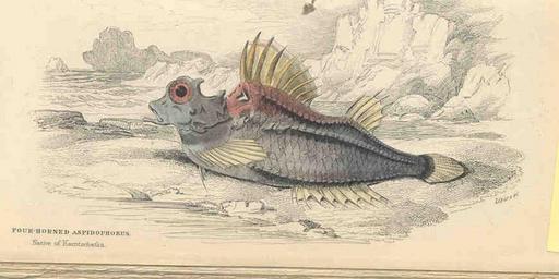 Keywords: FMIB 35939 Four-Horned Aspidophorus.jpeg Four-Horned Aspidophorus Native of Kamtschatka Subject Asphidophorus Tag Fish 1843 Cite book Fishes Particularly Their Structure and Economical Uses Bushnan John Stevenson London England Chatto and Windus 1843 Naturalist's Library v 35 Ichthyology vol 1 Facing page 150 Creator John Stevenson Bushnan PD-UWASH-FMIB Institution University of Washington FMIB-source accession number 35939 Images from the Freshwater and Marine Image Bank to check John Stevenson Bushnan Hypsagonus quadricornis |