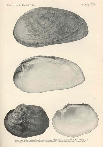 Keywords: FMIB 38271 Kidney-shell, Ptychobranchus phaseolus (Hildreth), from Obey River, Ky, upper pair; Rock pocketbook, Arcidens confragosus (Say.jpeg check categories 26 August 2015 4 Kidney-shell Ptychobranchus phaseolus Hildreth from Obey River Ky upper pair; Rock pocketbook Arcidens confragosus Say from Mississippi River lower pair Subject Ptychobranchus Arcidens Freshwater mussels Tag Shellfish 1921 Cite book Fresh-water Mussels and Mussel Industries of the United States Coker Robert E Washington DC Government Printing Office 1921 Bulletin of the United States Bureau of Fisheries vol 36 1917-1918 Plate XXI Creator Robert Ervin Coker PD-UWASH-FMIB Institution University of Washington FMIB-source accession number 38271 Images from the Freshwater and Marine Image Bank to check Robert Ervin Coker Ptychobranchus Arcidens Shellfish