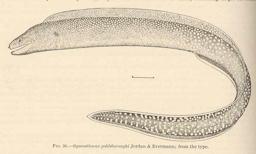 Keywords: FMIB 42391 Gymnothorax goldsboroughi Jordan & Evermann; from the type.jpeg Gymnothorax goldsboroughi Jordan Evermann; from the type Subject Morays Gymnothorax Tag Fish 1905 Cite book Shore Fishes of the Hawaiian Islands With a General Account of the Fish Fauna Jordan David Starr; Evermann Barton Warren Washington DC Government Printing Office 1905 Bulletin of the United States Fish Commission vol 23 for 1903 part I Fig 26 Creator David Starr Jordan Creator Barton Warren Evermann PD-UWASH-FMIB Institution University of Washington FMIB-source accession number 42391 Images from the Freshwater and Marine Image Bank to check David Starr Jordan Barton Warren Evermann Gymnothorax elegans |