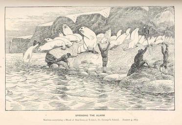 Keywords: FMIB 45384 Springing the Alarm.jpeg check categories 23 August 2015 2 Springing the Alarm Natives surprising a Herd of Sea-lions at Tolstoi St George's Island Subject Sea lions--Alaska Hunters--Alaska Sealing--Alaska Tag Aquatic Mammals 1897 Cite book Our Arctic Province Alaska and the Seal Islands Elliott Henry W New York City NY Charles Scribner's Sons 1897 Library of Contemporary Exploration and Adventure Facing page 366 Creator Henry Wood Elliott PD-UWASH-FMIB Institution University of Washington FMIB-source accession number 45384 Images from the Freshwater and Marine Image Bank to check Henry W Elliott Marine mammals |