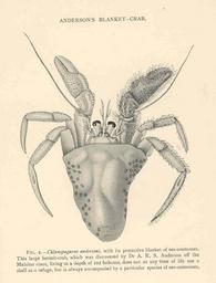 Keywords: FMIB 45417 Anderson's Blanket-Crab.jpeg check categories 23 August 2015 4 Anderson's Blanket-Crab Chlaenopagurus andersoni with its protective planket of sea-anemones This large hermit-crab which was discovered by Dr A R S Anderson off the Malabar coast living at a depth of 102 fathoms does not at any time of life use a shell as a refuge but is always accompanied by a particular species of sea-anemones Subject Hermit crabs Chlaenopagurus Tag Shellfish 1902 Cite book Naturalist in Indian Seas or Four Years with the Royal Indian Marine Survey Ship 'Investigator' Alcock Alfred W New York City NY E P Dutton Co 1902 Fig 2 Creator Alfred William Alcock PD-UWASH-FMIB Institution University of Washington FMIB-source accession number 45417 Images from the Freshwater and Marine Image Bank to check Alfred William Alcock Paguroidea Paguropsis Brachyura |