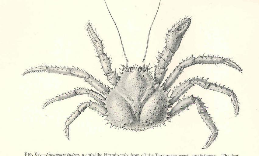 | Keywords: FMIB 45483 Deceptive Hermit-Crab of the Lithodes Group.jpeg  check categories 23 August 2015 4 Deceptive Hermit-Crab of the Lithodes Group Paralomis indica a crab-like Hermit-crab from off the Travancore coast 430 fathoms The last pair of legs are much reduced in size and are folded out of sight Subject Hermit crabs Paralomis Tag Shellfish 1902 Cite book Naturalist in Indian Seas or Four Years with the Royal Indian Marine Survey Ship 'Investigator' Alcock Alfred W New York City NY E P Dutton Co 1902 Fig 68 Creator Alfred William Alcock PD-UWASH-FMIB Institution University of Washington FMIB-source accession number 45483 Images from the Freshwater and Marine Image Bank to check Alfred William Alcock Paguroidea Paralomis Brachyura |