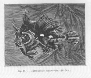 Keywords: FMIB 46946 Antennarius marmoratus (Bl Sch).jpeg Antennarius marmoratus Bl Sch Subject Antennarius Tag Fish 1885 Cite book Vie au Fond des Mers les Explorations Sous-Marines et les Voyages du Travailleur et du Talisman Filhol H Paris France G Masson Editeur 1885 Figure 34 A L Clement PD-UWASH-FMIB Institution University of Washington FMIB-source accession number 46946 Images from the Freshwater and Marine Image Bank to check A L Clement Histrio histrio |