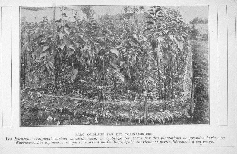 Keywords: FMIB 47203 Parc Ombrage par des Topinambours.jpeg check categories 16 September 2015 3 Parc Ombrage par des Topinambours Les Escargots craignant surtout la secheresse on ombrage les parcs par des plantations de grandes herbes ou d'arbustes Les topinambours qui fournissent un feuillage epais conviennent particulierement a cet usage<br Subject Snail farming Tag Mollusks 1911 Cite book l'Escargot Elevage et Parcage Lucratifs preparation culinaire et vente Boisseau G ; Lanorville G Paris France Librairie Hachette 1911 Plate 4 Creator G Boisseau Creator Georges Lanorville PD-UWASH-FMIB Institution University of Washington FMIB-source accession number 47203 Images from the Freshwater and Marine Image Bank to check G Boisseau Georges Lanorville Mollusca |