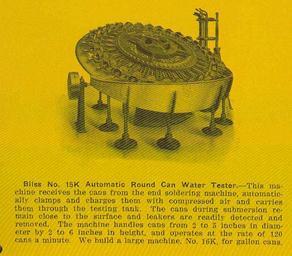 | Keywords: FMIB 47607 Bliss No15K Automatic Round Can Water Tester--This machine receives the cans from the end soldering machine, automatically.jpeg check categories 19 August 2015 1 Bliss No 15K Automatic Round Can Water Tester --This machine receives the cans from the end soldering machine automatically clamps and charges them with compressed air and carries them through the testing tank The cans during submersion remain close to the surface and leakers are readily detected and removed The machine handles cans from 2 to 5 inches in diameter by 2 to 6 inches in height and operates at the rate of 120 cans a minute We build a large machine No 16K for gallon cans Subject Fishery processing industries--Equipment and supplies Canneries--Equipment and supplies Tag Commercial Fisheries 1912 00 Cite book Bliss No 15K Automatic Round Can Water Tester --This machine receives the cans from the end soldering machine automatically clamps and charges them with compressed air and carries them through the testing tank The cans during submersion remain close to the surface and leakers are readily detected and removed The machine handles cans from 2 to 5 inches in diameter by 2 to 6 inches in height and operates at the rate of 120 cans a minute We build a large machine No 16K for gallon cans Seattle WA 1912 Pacific Fisherman Annual Statistical Review 1912 Facing page 51 author PD-UWASH-FMIB Institution University of Washington FMIB-source accession number 47607 Images from the Freshwater and Marine Image Bank to check Fisheries Bliss canning machinery |