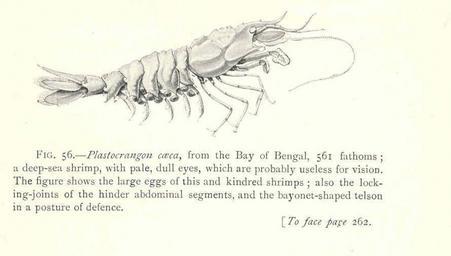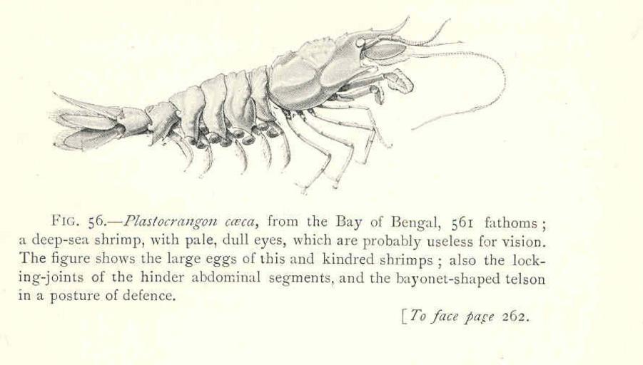 Keywords: FMIB 47678 Purblind Crustaceans.jpeg Purblind Crustaceans Plastocrangon caeca from the Bay of Bengal 561 fathoms; a deep-sea shrimp with pale dull eyes which are probably useless for vision The figure shows the large eggs of this and kindred shrimps; also the locking-joints of the hinder abdominal segments and the bayonet-shaped telson in a posture of defence Subject Shrimps Plastocrangon Tag Shellfish 1902 00 Cite book Naturalist in Indian Seas or Four Years with the Royal Indian Marine Survey Ship 'Investigator' Alcock Alfred W New York City NY E P Dutton Co 1902 Fig 56 Creator Alfred William Alcock PD-UWASH-FMIB Institution University of Washington FMIB-source accession number 47678 Images from the Freshwater and Marine Image Bank to check Alfred William Alcock |