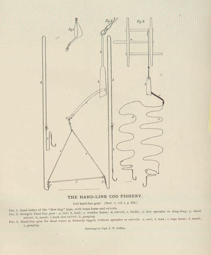 Keywords: FMIB 47683 Hand-Line Cod Fishery.jpeg check categories 19 August 2015 3 Hand-Line Cod Fishery Cod hand-line gear Fig 1 Lead sinker of the 'sow-bug' type with brass horse and swivels Fig 2 George's hand-line gear 1 tail; b lead; c wooden horse; d swivel; e bridle; f iron spreader or sling-ding; g snood swivel; h snood; i book slot-swivel; k ganging RFig 3 Hand-line gear for shoal water as formerly rigged without spreader or swivels a reel; b lead; c rope horse; d snood; e ganging Subject Cod fisheries--Equipment and supplies Fisheries--Equipment and supplies Tag Fisheries Techniques 1887 00 Cite book Fisheries and Fishery Industries of the United States Goode George Brown Washington DC Government Printing Office 1887 Plate 31 Creator Joseph William Collins PD-UWASH-FMIB Institution University of Washington FMIB-source accession number 47683 Images from the Freshwater and Marine Image Bank to check Joseph William Collins Fishing equipment Fisheries |