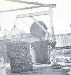 Keywords: FMIB 47729 Iron cooker or 'kettle,' the usual apparatus employed in steaming hard crabs.jpeg check categories 19 September 2015 2 Iron cooker or 'kettle ' the usual apparatus employed in steaming hard crabs The baskets of crabs are hoisted in and out of the cooker by means of the crane The tongs hanging on the upright post are used in picking out individual living crabs in case any sorting of the catch is desired Subject Crab fisheries Cookery Crabs Geographic Subject Chesapeake Bay Md and Va Tag Fisheries Techniques 1920 00 Cite book Crab industry of Chesapeake Bay Report of the United States Commissioner of Fisheries for the Fiscal Year 1918 with Appendixes Churchill E P Jr Washington DC Government Printing Office 1920 Plate VIII Fig 1 E P Churchill Jr PD-UWASH-FMIB Institution University of Washington FMIB-source accession number 47729 Images from the Freshwater and Marine Image Bank to check E P Churchill Jr Fisheries |