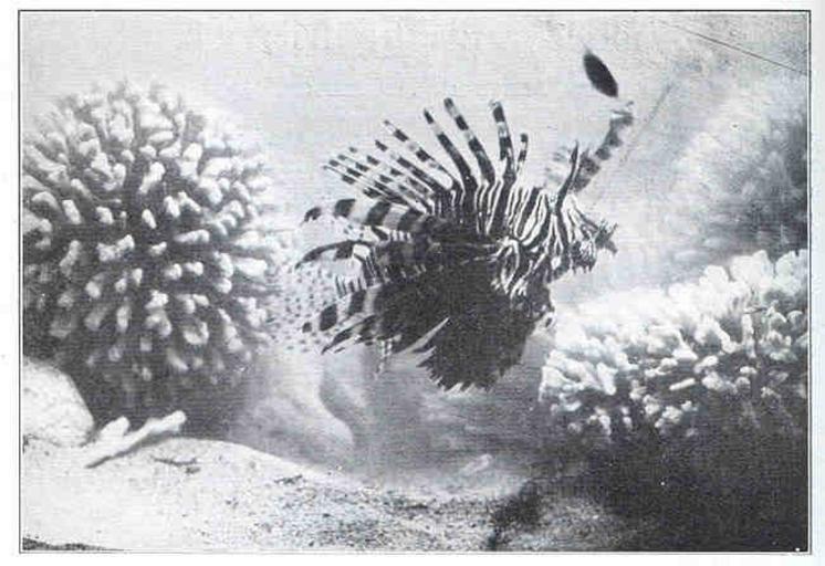 Keywords: FMIB 47744 Butterfly Cod (Pterols volitans) A fish of evil reputation but extraordinary beauty Having numerous sp8ines endowed tih venom.jpeg check categories 19 September 2015 2 Butterfly Cod Pterols volitans A fish of evil reputation but extraordinary beauty Having numerous sp8ines endowed tih venom-glands it is accorded proper respect by its neighbours before whom it flaunts its greatly enlarged and gorgeously coloured fins Subject Photography of fishes Pterois volitans Tag Fish 1924 00 Cite book Fishes and the Movies Australian Museum Magazine v 2 1924 McCulloch Allan R Sydney Australia Australian Museum 1924 104 A R McCulloch PD-UWASH-FMIB Institution University of Washington FMIB-source accession number 47744 Images from the Freshwater and Marine Image Bank to check A R McCulloch Pterois volitans |