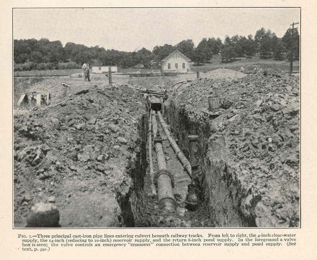Keywords: FMIB 47861 Three principal cast-iron pipe lines entering culvert beneath railray tracks From left to right, the 4-inch clear-water supply.jpeg check categories 28 August 2015 4 Three principal cast-iron pipe lines entering culvert beneath railray tracks From left to right the 4-inch clear-water supply the 14-inch reducing to 10-inch reservoir supply and the return 8-inch pond supply In the forground a valve box is seen; the valve controls an emergency 'crossover' connection between reservoir supply and pond supply Subject Biological stations Fisheries research Fairport Fisheries Biological Station Fairport Iowa Pipelines Water supply Geographic Subject United States--Iowa--Fairport Tag Hatcheries 1916 00 Cite book Fairport Fisheries Biological Station Its Equipment Organization and Functions Coker Robert E Washington DC Government Printing Office 1916 Bulletin of the United States Bureau of Fisheries vol 34 1914 Plate LXXVIII-7 Creator Robert Ervin Coker PD-UWASH-FMIB Institution University of Washington FMIB-source accession number 47861 Images from the Freshwater and Marine Image Bank to check Robert Ervin Coker Biological stations Pipelines Fish hatcheries |