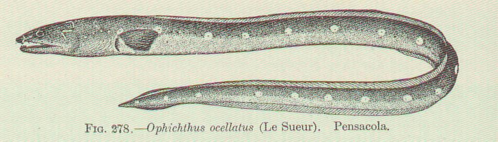 Keywords: FMIB 51815 Ophiuchthus ocellatus (Le Sueur) Pensacola.jpeg Ophiuchthus ocellatus Le Sueur Pensacola Subject Eels Tag Fish 1907 Cite book Fishes Jordan David Starr New York City NY Henry Holt and Company 1907 Fig 278 Creator David Starr Jordan PD-UWASH-FMIB Institution University of Washington FMIB-source accession number 51815 Images from the Freshwater and Marine Image Bank to check David Starr Jordan Myrichthys ocellatus |
