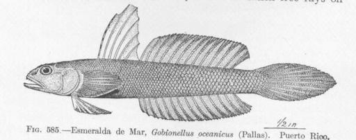 | Keywords: FMIB 52157 Esmeralda de Mar, Gobionellus oceanicus (Pallas) Puerto Rico.jpeg Esmeralda de Mar Gobionellus oceanicus Pallas Puerto Rico Subject Gobiidae Tag Fish 1907 Cite book Fishes Jordan David Starr New York City NY Henry Holt and Company 1907 Fig 585 Creator David Starr Jordan PD-UWASH-FMIB Institution University of Washington FMIB-source accession number 52157 Images from the Freshwater and Marine Image Bank to check David Starr Jordan Gobionellus oceanicus | ||||