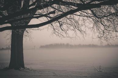 Keywords: Fog rolling away in the morning on the farm morning winter cloud snow tree field silhouette fog landscape glow farm country eerie faded barren