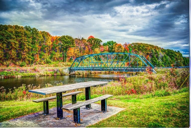 Keywords: foliage bridge fall autumn landscape nature park outdoors leaf yellow environment color colorful leaves scenic picnic table scene