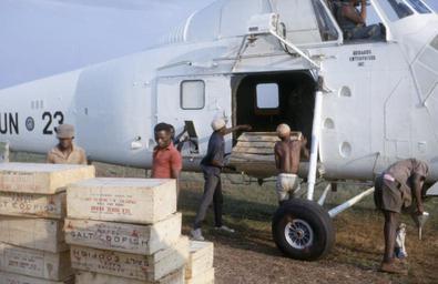 | Keywords: Food aid Nigeria.png en This photograph showed members of the Nigerian-Biafran civil war relief team unloading crates of codfish which were airlifted from either of the Nigerian cities of Calabar or Port Harcourt With the assistance of the Nigerian military food supplies like the dried fish shown here were distributed to Red Cross refugee camps outside of the war zone The CDC responded to widespread famine among refugees of the civil war by carrying out rapid health and nutrition assessments coordinating the overall health and nutrition response and implementing surveillance systems to track rates of illness and death Creation Date 1968 1968 CDC http //phil cdc gov/phil/details asp CDC/ Dr Lyle Conrad other versions PD-USGov Uploaded with UploadWizard Nigeria in the 1960s Famines in Africa United Nations Images from the CDC Public Health Image Library |