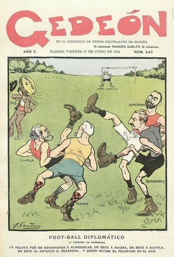 Keywords: Foot-ball diplomático, de Joaquín Xaudaró.jpg Portada del 17 de junio de 1904 de la revista satírica española Gedeón Foot-ball diplomático 1904 6 17 Gedeón Foot-ball diplomático 447 1 http //hemerotecadigital bne es/issue vm id 0003065326 page 1 date 1904 6 17 Creator Joaquín Xaudaró PD-Scan PD-old-auto-1923 1933 Caricatures by Joaquín Xaudaró in Gedeón 1904 in Spain Francisco Silvela caricatures Antoni Maura caricatures Count of Romanones caricatures Juan Manuel Sánchez y Gutiérrez de Castro Fernando León y Castillo caricatures Political cartoons of Spain |