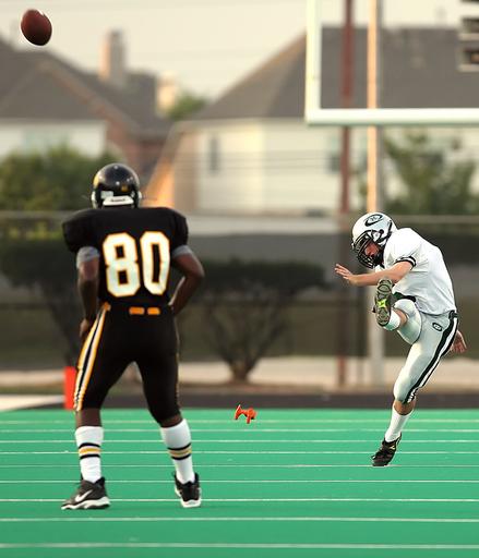 Keywords: football kickoff kicker kick sport field game play ball competition player green uniform athlete male athletics pigskin action outdoor