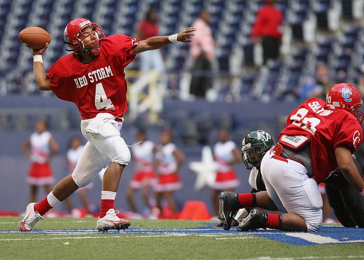 Keywords: football quarterback passing action player throwing stadium american football field uniform ball sport american football field competition team male helmet teamwork activity arena game competitive play red texas texan high school