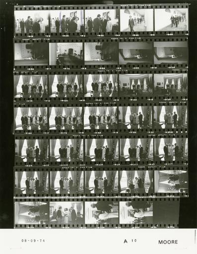 | Keywords: Ford A0010 NLGRF photo contact sheet (1974-08-09)(Gerald Ford Library).jpg White House Photographic Office WHPO is housed at the Gerald R Ford Presidential Library a branch of the National Archives and Records Administration NARA <br/><br/> This file is a 200 dpi photo contact sheet having images from roll of film A0010 of the August 9 1974 - January 20 1977 Gerald R Ford White House Photographic Office Series A0001-A9999 and B0001-B2886 photographs <br/><br/> The date on the photo contact sheet is the date the roll of film was processed not necessarily the date the photographs were taken See table below for additional details 1974-08-09 Gerald R Ford Presidential Library Image http //www fordlibrarymuseum gov/library/whphotos/A0010_NLGRF jpg A0010_NLGRF jpg from http //www fordlibrarymuseum gov/library/whphotos/19740809whpo pdf White House Photographs August 9 1974 of the http //www fordlibrarymuseum gov/Library/whphotos/whpo asp White House Photographic Collection page White House Photographic Office WHPO - Moore PD-USGov Institution Institution Gerald R Ford Presidential Library Table wikitable sortable + Photo contact sheet A0010 U S President Ford Administration Gerald R Ford Library Frame s Tone Subject proper Subject generic Names Geographic Location Photographer Date - 1A-3A BW Reception Following Swearing in of Gerald R Ford as the 38th President of the United States handshaking GRF Betty Ford Guests White House Moore 1974-08-09 - 4A-5A BW Marine Military Aide Sardo walking GRF staff Rick Sardo 3rd Colonnade Moore 1974-08-09 - 6A-10A BW Following Swearing in of Gerald R Ford as the 38th President of the United States sitting alone in empty room GRF Roosevelt Room Moore 1974-08-09 - 11A-13A BW First Family - Following Swearing in of Gerald R Ford as the 38th President of the United States close up GRF Betty Ford Jack Steve Susan Michael Gayle Oval Office Moore 1974-08-09 - 14A-15A BW First Family - Following Swearing in of Gerald R Ford as the 38th President of the United States long shot GRF Betty Ford Jack Steve Susan Michael Gayle Oval Office Moore 1974-08-09 - 16A-18A BW First Family - Following Swearing in of Gerald R Ford as the 38th President of the United States; Family Housekeeper close up GRF Betty Ford Jack Steve Susan Michael Gayle Clara Powell Oval Office Moore 1974-08-09 - 19A-21A BW Half-brother and sister-in-law of Gerald R Ford -Following Swearing in of Gerald R Ford as the 38th President of the United States close up GRF Betty Ford Tom Ford Janet Ford Oval Office Moore 1974-08-09 - 22A-24A BW Following Swearing in of Gerald R Ford as the 38th President of the United States close up GRF Betty Ford Mr Mrs Leon Parma Oval Office Moore 1974-08-09 - 25A-28A BW Following Swearing in of Gerald R Ford as the 38th President of the United States close up GRF Betty Ford Unidentified couple Oval Office Moore 1974-08-09 - 29A-31A BW Following Swearing in of Gerald R Ford as the 38th President of the United States close up GRF Betty Ford Oval Office Moore 1974-08-09 - 32A-34A BW talking - Following Swearing in of Gerald R Ford as the 38th President of the United States close up GRF Betty Ford Michael Ford Oval Office Moore 1974-08-09 Gerald R Ford Presidential Library and Museum-cooperation PD-USGov Contact sheets by the Ford White House August 1974 |