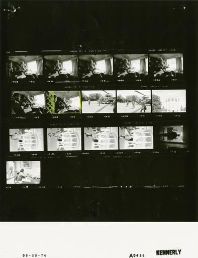 | Keywords: Ford A0436 NLGRF photo contact sheet (1974-08-30)(Gerald Ford Library).jpg White House Photographic Office WHPO is housed at the Gerald R Ford Presidential Library a branch of the National Archives and Records Administration NARA <br/><br/> This file is a 200 dpi photo contact sheet having images from roll of film A0436 of the August 9 1974 - January 20 1977 Gerald R Ford White House Photographic Office Series A0001-A9999 and B0001-B2886 photographs <br/><br/> The date on the photo contact sheet is the date the roll of film was processed not necessarily the date the photographs were taken See table below for additional details 1974-08-30 Gerald R Ford Presidential Library Image http //www fordlibrarymuseum gov/library/whphotos/A0436_NLGRF jpg A0436_NLGRF jpg from http //www fordlibrarymuseum gov/library/whphotos/19740830whpo pdf White House Photographs August 30 1974 of the http //www fordlibrarymuseum gov/Library/whphotos/whpo asp White House Photographic Collection page White House Photographic Office WHPO <br/> Creator David Hume Kennerly PD-USGov Institution Institution Gerald R Ford Presidential Library Table wikitable sortable + Photo contact sheet A0436 U S President Ford Administration Gerald R Ford Library Frame s Tone Subject proper Subject generic Names Geographic Location Photographer Date - 3-7 BW Return from Andrews Air Force Base reading; pipe in mouth; glasses on top of head GRF Washington DC Marine One Kennerly 1974-08-30 - 8-9 BW Return from Andrews Air Force Base talking; glasses on top of head GRF Haig Washington DC Marine One Kennerly 1974-08-30 - 10-11 BW Return from Andrews Air Force Base waving walking from helicopter GRF Secret Service Marine One Crew South Lawn Kennerly 1974-08-30 - 12-16 BW Return from Andrews Air Force Base GRF walking; Mrs Ford and Howe waving from Balcony GRF Betty Ford Nancy Howe Others South Lawn towards Truman Balcony Kennerly 1974-08-30 - 17 BW walking into Cross Hall GRF Blue Room Kennerly 1974-08-30 - 18 BW Staff Assistant on telephone Nell Yates Secretary's Office Kennerly 1974-08-30 Gerald R Ford Presidential Library and Museum-cooperation PD-USGov Contact sheets by the Ford White House August 1974 Photographs by David Hume Kennerly from 1974 |