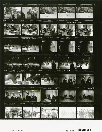 | Keywords: Ford A0948 NLGRF photo contact sheet (1974-09-22)(Gerald Ford Library).jpg White House Photographic Office WHPO is housed at the Gerald R Ford Presidential Library a branch of the National Archives and Records Administration NARA <br/><br/> This file is a 200 dpi photo contact sheet having images from roll of film A0948 of the August 9 1974 - January 20 1977 Gerald R Ford White House Photographic Office Series A0001-A9999 and B0001-B2886 photographs <br/><br/> The date on the photo contact sheet is the date the roll of film was processed not necessarily the date the photographs were taken See table below for additional details 1974-09-22 Gerald R Ford Presidential Library Image http //www fordlibrarymuseum gov/library/whphotos/A0948_NLGRF jpg A0948_NLGRF jpg from http //www fordlibrarymuseum gov/library/whphotos/19740922whpo pdf White House Photographs September 22 1974 of the http //www fordlibrarymuseum gov/Library/whphotos/whpo asp White House Photographic Collection page White House Photographic Office WHPO <br/> Creator David Hume Kennerly PD-USGov Institution Institution Gerald R Ford Presidential Library Table wikitable sortable + Photo contact sheet A0948 U S President Ford Administration Gerald R Ford Library Frame s Tone Subject proper Subject generic Names Geographic Location Photographer Date - 3 BW Arriving for Sunday Church Services getting out of limousine GRF Betty Ford Others Washington DC St John's Episcopal Church - Lafayette Square Kennerly 1974-09-22 - 4 BW Arriving for Sunday Church Services walking into church GRF Betty Ford Keiser Others Washington DC St John's Episcopal Church - Lafayette Square Kennerly 1974-09-22 - 5-7 BW Tennis Match between Haig Bush Rustand and unidentified man Rustand returning volley Haig Rustand White House Tennis Court Kennerly 1974-09-22 - 8-9 BW talking on telephone seated in rattan chair Kennerly Washington DC David Kennerly residence Kennerly 1974-09-23 - 10-12 BW Breakfast hosted by Sen Mansfield seated talking GRF Sens Mansfield Byrd Mathias Inouye Maureen Mansfield Jane Engelhardt Others Washington DC Senator Mike Mansfield Residence - Living Room Kennerly 1974-09-23 - 13-14 BW Ninth World Energy Conference - Detroit Michigan standing; Bechtel at podium introducing GRF GRF Steve Bechtel Platform Guests Detroit MI Cobo Arena Kennerly 1974-09-23 - 15-17 BW Address before the Ninth World Energy Conference - Detroit Michigan speaking from podium - medium range GRF Detroit MI Cobo Arena Kennerly 1974-09-23 - 18-24 BW Ninth World Energy Conference - Detroit Michigan GRF speaking from podium - long shots various angles GRF Platform Guests Others Detroit MI Cobo Arena Kennerly 1974-09-23 - 25 BW Ninth World Energy Conference - Detroit Michigan GRF and Bechtel leaving arena GRF Steve Bechtel Secret Service Platform Guests Others Detroit MI Cobo Arena Kennerly 1974-09-23 - 26 BW Following Ninth World Energy Conference - Detroit Michigan standing talking; Todd in background GRF Steve Bechtel Todd Detroit MI Cobo Arena - VIP Reception Area Kennerly 1974-09-23 - 27 BW Following Ninth World Energy Conference - Detroit Michigan standing talking GRF Steve Bechtel Detroit MI Cobo Arena - VIP Reception Area Kennerly 1974-09-23 - 28-29 BW Following Ninth World Energy Conference - Detroit Michigan standing talking; all not in both frames GRF Steve Bechtel Others Detroit MI Cobo Arena - VIP Reception Area Kennerly 1974-09-23 - 30 BW Mayor of Detroit; Following Ninth World Energy Conference - Detroit Michigan seated smiling GRF Mayor Coleman Young Detroit MI Cobo Arena - VIP Reception Area Kennerly 1974-09-23 - 31-32 BW Mayor of Detroit; Following Ninth World Energy Conference - Detroit Michigan seated talking; Raoul-Duval taking notes GRF Mayor Coleman Young Raoul-Duval Deputy Mayor William J Beckham Detroit MI Cobo Arena - VIP Reception Area Kennerly 1974-09-23 - 33 BW Mayor of Detroit; Following Ninth World Energy Conference - Detroit Michigan talking walking toward limousine - media in background GRF Mayor Coleman A Young Media Detroit MI Outside Cobo Hall Kennerly 1974-09-23 - 34-35 BW Departure following Ninth World Energy Conference - Romulus Michigan greeting handshaking GRF police officers Romulus MI Metropolitan Airport - American Airlines Hangar Kennerly 1974-09-23 - 36-37 BW Departure following Ninth World Energy Conference - Romulus Michigan greeting handshaking GRF local Secret Service agents Romulus MI Metropolitan Airport - American Airlines Hangar Kennerly 1974-09-23 Gerald R Ford Presidential Library and Museum-cooperation PD-USGov Contact sheets by the Ford White House September 1974 Photographs by David Hume Kennerly from 1974 |