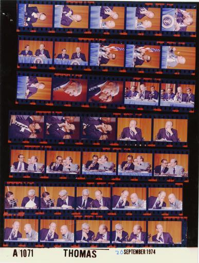 | Keywords: Ford A1071 NLGRF photo contact sheet (1974-09-27)(Gerald Ford Library).jpg White House Photographic Office WHPO is housed at the Gerald R Ford Presidential Library a branch of the National Archives and Records Administration NARA <br/><br/> This file is a 200 dpi photo contact sheet having images from roll of film A1071 of the August 9 1974 - January 20 1977 Gerald R Ford White House Photographic Office Series A0001-A9999 and B0001-B2886 photographs <br/><br/> The date on the photo contact sheet is the date the roll of film was processed not necessarily the date the photographs were taken See table below for additional details 1974-09-27 Gerald R Ford Presidential Library Image http //www fordlibrarymuseum gov/library/whphotos/A1071_NLGRF jpg A1071_NLGRF jpg from http //www fordlibrarymuseum gov/library/whphotos/19740927whpo pdf White House Photographs September 27 1974 of the http //www fordlibrarymuseum gov/Library/whphotos/whpo asp White House Photographic Collection page White House Photographic Office WHPO - Thomas PD-USGov Institution Institution Gerald R Ford Presidential Library Table wikitable sortable + Photo contact sheet A1071 U S President Ford Administration Gerald R Ford Library Frame s Tone Subject proper Subject generic Names Geographic Location Photographer Date - 3-4 Color Conference on Inflation seated listening GRF Lynn Washington DC Washington Hilton Hotel - International Ballroom Thomas 1974-09-27 - 9 Color Conference on Inflation seated holding pen GRF Washington DC Washington Hilton Hotel - International Ballroom Thomas 1974-09-27 - 10-11 Color Conference on Inflation seated leaning towards each other talking GRF Seidman Washington DC Washington Hilton Hotel - International Ballroom Thomas 1974-09-27 - 12 Color Conference on Inflation seated leaning towards each other talking GRF Lynn Washington DC Washington Hilton Hotel - International Ballroom Thomas 1974-09-27 - 5-6 Color Conference on Inflation seated listening smoking pipe Sec Simon Washington DC Washington Hilton Hotel - International Ballroom Thomas 1974-09-27 - 7 Color Conference on Inflation seated listening smoking pipe Seidman Washington DC Washington Hilton Hotel - International Ballroom Thomas 1974-09-27 - 13 Color Conference on Inflation seated right hand on chin taking notes GRF Washington DC Washington Hilton Hotel - International Ballroom Thomas 1974-09-27 - 14 Color Conference on Inflation right side profile Burns Washington DC Washington Hilton Hotel - International Ballroom Thomas 1974-09-27 - 15 Color Conference on Inflation right side profiles Burns Sec Simon Washington DC Washington Hilton Hotel - International Ballroom Thomas 1974-09-27 - 16-17 Color Conference on Inflation seated listening -GRF smoking pipe Sen Tower Lynn GRF Washington DC Washington Hilton Hotel - International Ballroom Thomas 1974-09-27 - 18-20 Color Conference on Inflation seated removing glasses Amb Dent Washington DC Washington Hilton Hotel - International Ballroom Thomas 1974-09-27 - 21-22 Color Conference on Inflation seated holding pen in mouth GRF Washington DC Washington Hilton Hotel - International Ballroom Thomas 1974-09-27 - 23-27 Color Conference on Inflation talking gesturing smiling - Simon smoking pipe Sec Simon Sen Humphrey Washington DC Washington Hilton Hotel - International Ballroom Thomas 1974-09-27 - 28-29 Color Conference on Inflation seated talking leaning towards each other Sen Tower Sec Morton Washington DC Washington Hilton Hotel - International Ballroom Thomas 1974-09-27 - 30 Color Conference on Inflation seated talking leaning towards each other Sec Morton GRF Washington DC Washington Hilton Hotel - International Ballroom Thomas 1974-09-27 - 31-34 Color Conference on Inflation seated talking leaning towards each other GRF Seidman Washington DC Washington Hilton Hotel - International Ballroom Thomas 1974-09-27 - 35-36 Color Conference on Inflation seated talking leaning towards each other -GRF wearing glasses Sec Morton GRF Washington DC Washington Hilton Hotel - International Ballroom Thomas 1974-09-27 - 37 Color Conference on Inflation seated listening wearing glasses GRF Washington DC Washington Hilton Hotel - International Ballroom Thomas 1974-09-27 - 8 Color Conference on Inflation seated listening taking notes hand on chin Ash Washington DC Washington Hilton Hotel - International Ballroom Thomas 1974-09-27 Gerald R Ford Presidential Library and Museum-cooperation PD-USGov Contact sheets by the Ford White House September 1974 Conference on Inflation 1974 |
