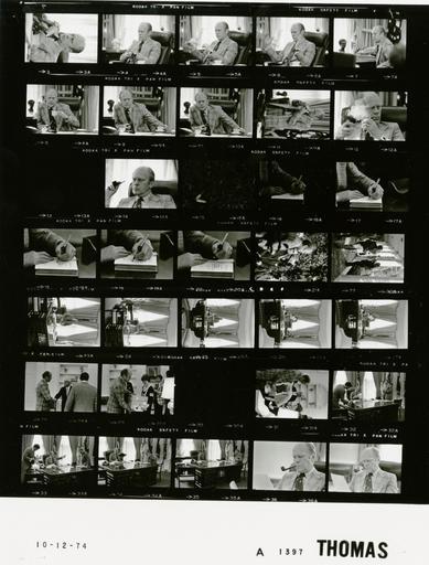 Keywords: Ford A1397 NLGRF photo contact sheet (1974-10-12)(Gerald Ford Library).jpg White House Photographic Office WHPO is housed at the Gerald R Ford Presidential Library a branch of the National Archives and Records Administration NARA <br/><br/> This file is a 200 dpi photo contact sheet having images from roll of film A1397 of the August 9 1974 - January 20 1977 Gerald R Ford White House Photographic Office Series A0001-A9999 and B0001-B2886 photographs <br/><br/> The date on the photo contact sheet is the date the roll of film was processed not necessarily the date the photographs were taken See table below for additional details 1974-10-12 Gerald R Ford Presidential Library Image http //www fordlibrarymuseum gov/library/whphotos/A1397_NLGRF jpg A1397_NLGRF jpg from http //www fordlibrarymuseum gov/library/whphotos/19741012whpo pdf White House Photographs October 12 1974 of the http //www fordlibrarymuseum gov/Library/whphotos/whpo asp White House Photographic Collection page White House Photographic Office WHPO - Thomas PD-USGov Institution Institution Gerald R Ford Presidential Library Table wikitable sortable + Photo contact sheet A1397 U S President Ford Administration Gerald R Ford Library Frame s Tone Subject proper Subject generic Names Geographic Location Photographer Date - 3-7 BW seated at desk talking GRF Oval Office Thomas 1974-10-12 - 8-10 BW seated at desk talking holding coffee cup GRF Oval Office Thomas 1974-10-12 - 11 BW standing lighting pipe GRF Oval Office Thomas 1974-10-12 - 12 BW seated at desk smoking pipe GRF Oval Office Thomas 1974-10-12 - 13 BW Thomas 1974-10-12 - 14 BW seated at desk smoking pipe GRF Oval Office Thomas 1974-10-12 - 15 BW Thomas 1974-10-12 - 16-20 BW hands only signing book Roudebush Bible GRF Oval Office Thomas 1974-10-12 - 21 BW Swearing in of Administrator of the Veterans Administration standing at microphone talking GRF Rose Garden Thomas 1974-10-12 - 22 BW Following Swearing in of Administrator of the Veterans Administration returning to Oval Office GRF Others Colonnade Thomas 1974-10-12 - 23-27 BW standing behind desk reading documents GRF Oval Office Thomas 1974-10-12 - 28-29 BW Signing Ceremony of National Newspaper Carrier Day Proclamation greeting handshaking -all not in every frame GRF William Merritt Lu Ann Leno Matt Singer Paul Carr Oval Office Thomas 1974-10-12 - 30 BW Thomas 1974-10-12 - 31 BW Signing Ceremony of National Newspaper Carrier Day Proclamation greeting handshaking -all not in every frame GRF William Merritt Lu Ann Leno Matt Singer Paul Carr Oval Office Thomas 1974-10-12 - 32-33 BW GRF seated at desk; others standing on either side GRF O'Donnell Hartmann Oval Office Thomas 1974-10-12 - 34-35 BW seated around desk GRF Hartmann Oval Office Thomas 1974-10-12 - 36-37 BW seated at desk reading smoking pipe; close up GRF Oval Office Thomas 1974-10-12 Gerald R Ford Presidential Library and Museum-cooperation PD-USGov Contact sheets by the Ford White House October 1974