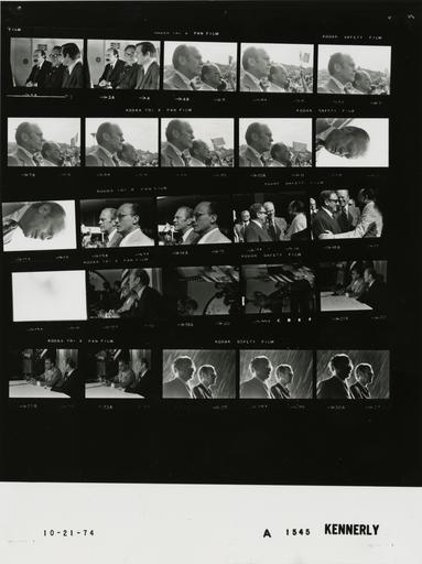 | Keywords: Ford A1545 NLGRF photo contact sheet (1974-10-21)(Gerald Ford Library).jpg White House Photographic Office WHPO is housed at the Gerald R Ford Presidential Library a branch of the National Archives and Records Administration NARA <br/><br/> This file is a 200 dpi photo contact sheet having images from roll of film A1545 of the August 9 1974 - January 20 1977 Gerald R Ford White House Photographic Office Series A0001-A9999 and B0001-B2886 photographs <br/><br/> The date on the photo contact sheet is the date the roll of film was processed not necessarily the date the photographs were taken See table below for additional details 1974-10-21 Gerald R Ford Presidential Library Image http //www fordlibrarymuseum gov/library/whphotos/A1545_NLGRF jpg A1545_NLGRF jpg from http //www fordlibrarymuseum gov/library/whphotos/19741021whpo pdf White House Photographs October 21 1974 of the http //www fordlibrarymuseum gov/Library/whphotos/whpo asp White House Photographic Collection page White House Photographic Office WHPO <br/> Creator David Hume Kennerly PD-USGov Institution Institution Gerald R Ford Presidential Library Table wikitable sortable + Photo contact sheet A1545 U S President Ford Administration Gerald R Ford Library Frame s Tone Subject proper Subject generic Names Geographic Location Photographer Date - 15A-16A BW Trip to Mexico; President of Mexico talking smiling GRF Luis Echeverria Kissinger Magdalena Mexico La Plaza Del Padre Kino Kennerly 1974-10-21 - 17A BW Kennerly 1974-10-21 - 18A-23A BW Trip to Arizona; President of Mexico; Press Conference - Tubac Arizona seated talking into microphones - head and shoulder portrait s GRF Luis Echeverria Tubac AZ Tubac Country Club - The Saddle Restaurant Kennerly 1974-10-21 - 24A-26A BW Trip to Arizona; President of Mexico - Tucson Arizona standing in rain - left side profiles; night shots GRF Luis Echeverria Tucson AZ Davis-Monthan Air Force Base Kennerly 1974-10-21 - 2A-3A BW Flight from Davis-Monthan Air Force Base to Nogales Arizona seated talking; copter Rumsfeld Kissinger Amb Jose Juan de Olloqui Marine One Kennerly 1974-10-21 - 4A-10A BW Trip to Mexico; President of Mexico -Nogales Arizona/Nogales Mexico standing right side head and shoulder profiles - crowd in background GRF Luis Echeverria Crowd Nogales AZ / Nogales Mexico United States - Mexico Border Kennerly 1974-10-21 - 11A-12A BW Trip to Mexico - Nogales Arizona/Nogales Mexico right side head and shoulder profile GRF Nogales AZ / Nogales Mexico United States - Mexico Border Kennerly 1974-10-21 - 13A-14A BW Trip to Mexico; President of Mexico left side head and shoulder profiles GRF Luis Echeverria Magdalena Mexico La Plaza Del Padre Kino Kennerly 1974-10-21 Gerald R Ford Presidential Library and Museum-cooperation PD-USGov Contact sheets by the Ford White House October 1974 Photographs by David Hume Kennerly from 1974 |