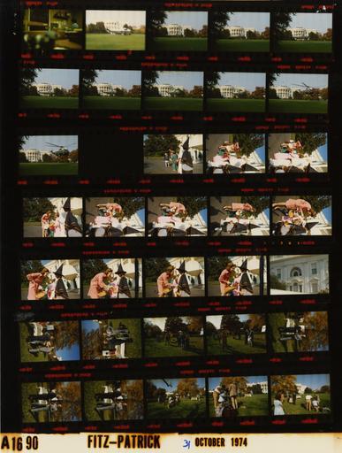 | Keywords: Ford A1690 NLGRF photo contact sheet (1974-10-31)(Gerald Ford Library).jpg White House Photographic Office WHPO is housed at the Gerald R Ford Presidential Library a branch of the National Archives and Records Administration NARA <br/><br/> This file is a 200 dpi photo contact sheet having images from roll of film A1690 of the August 9 1974 - January 20 1977 Gerald R Ford White House Photographic Office Series A0001-A9999 and B0001-B2886 photographs <br/><br/> The date on the photo contact sheet is the date the roll of film was processed not necessarily the date the photographs were taken See table below for additional details 1974-10-31 Gerald R Ford Presidential Library Image http //www fordlibrarymuseum gov/library/whphotos/A1690_NLGRF jpg A1690_NLGRF jpg from http //www fordlibrarymuseum gov/library/whphotos/19741031whpo pdf White House Photographs October 31 1974 of the http //www fordlibrarymuseum gov/Library/whphotos/whpo asp White House Photographic Collection page White House Photographic Office WHPO - Fitz-Patrick PD-USGov Institution Institution Gerald R Ford Presidential Library Table wikitable sortable + Photo contact sheet A1690 U S President Ford Administration Gerald R Ford Library Frame s Tone Subject proper Subject generic Names Geographic Location Photographer Date - 2A Color seated typing Unidentified Woman East Wing Office Fitz-Patrick 1974-10-31 - 3A Color helicopter sitting on lawn; White House in background Marine One South Lawn Fitz-Patrick 1974-10-31 - 4A-12A Color Flight to Andrews Air Force Base helicopter taking off of lawn; White House in background Marine One South Lawn Fitz-Patrick 1974-10-31 - 13A Color Fitz-Patrick 1974-10-31 - 14A-25A Color Trick or Treat for UNICEF Children standing Mrs Ford walking putting treats in bags Betty Ford Children in Costumes South Driveway Fitz-Patrick 1974-10-31 - 26A Color Second Floor - West Sitting Hall Window from Outside Outside West Wing of White House Fitz-Patrick 1974-10-31 - 27A-33A Color Prior to Making public service film The Time of Your Life supporting the Presidential Sports Award Program standing setting up for taped message; White House in background GRF Sound Film Technicians South Lawn Fitz-Patrick 1974-10-31 - 34A-36A Color Making Public Service Film The Time of Your Life supporting the Presidential Sports Award Program standing setting up for taped message; White House in background GRF Sound Film Technicians South Lawn Fitz-Patrick 1974-10-31 Gerald R Ford Presidential Library and Museum-cooperation PD-USGov Contact sheets by the Ford White House October 1974 |