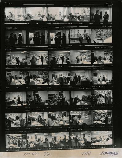 | Keywords: Ford A1810 NLGRF photo contact sheet (1974-11-06)(Gerald Ford Library).jpg White House Photographic Office WHPO is housed at the Gerald R Ford Presidential Library a branch of the National Archives and Records Administration NARA <br/><br/> This file is a 200 dpi photo contact sheet having images from roll of film A1810 of the August 9 1974 - January 20 1977 Gerald R Ford White House Photographic Office Series A0001-A9999 and B0001-B2886 photographs <br/><br/> The date on the photo contact sheet is the date the roll of film was processed not necessarily the date the photographs were taken See table below for additional details 1974-11-06 Gerald R Ford Presidential Library Image http //www fordlibrarymuseum gov/library/whphotos/A1810_NLGRF jpg A1810_NLGRF jpg from http //www fordlibrarymuseum gov/library/whphotos/19741106whpo pdf White House Photographs November 6 1974 of the http //www fordlibrarymuseum gov/Library/whphotos/whpo asp White House Photographic Collection page White House Photographic Office WHPO <br/> Creator David Hume Kennerly PD-USGov Institution Institution Gerald R Ford Presidential Library Table wikitable sortable + Photo contact sheet A1810 U S President Ford Administration Gerald R Ford Library Frame s Tone Subject proper Subject generic Names Geographic Location Photographer Date - 12-14 BW Presidential Tour of Old Executive Office Building greeting talking - all not in every frame GRF O'Donnell Mary Burns Beulah Baker Sarah Young Dorothy Spicer Helen White Ruth Krell Mary Lindsay Old Executive Office Building OEOB -Telephone Room Kennerly 1974-11-06 - 15-18 BW Presidential Tour of Old Executive Office Building greeting talking - all not in every frame GRF Dan Marks John Heiting Thomas Jones Linder; Rumsfeld Old Executive Office Building OEOB -Records Office Kennerly 1974-11-06 - 19 BW Presidential Tour of Old Executive Office Building greeting handshaking GRF Pierpont Mobley Lou Ann Francis Old Executive Office Building OEOB -Personnel Office Kennerly 1974-11-06 - 20-22 BW Presidential Tour of Old Executive Office Building greeting talking - all not in every frame GRF Thomas English Helen Hughes Margaret Peay Mathilda Morton Douglas Scott Old Executive Office Building OEOB -Administrative Office Kennerly 1974-11-06 - 23-25 BW Presidential Tour of Old Executive Office Building greeting talking - all not in every frame GRF James Smoot Thomas Dobin David Robinson Old Executive Office Building OEOB -Messenger Room Kennerly 1974-11-06 - 26-32 BW Presidential Tour of Old Executive Office Building greeting talking - all not in every frame GRF Flora Carroll Samuel Brungo Alvester Wilbanks Burtion Quigley Ruth Fantasia Mary Simon Virginia Hurt James Butler Bonnie Baxter James Buckler Delbert Fogelson Joan Lakes Charles Jones James Reagan Nile Kilgore Linder Old Executive Office Building OEOB -Mail Room Kennerly 1974-11-06 - 33-36 BW Presidential Tour of Old Executive Office Building greeting talking - all not in every frame GRF Linder William Matthews Norbert Strube Gordon Hobbs Everline Fisher Dolores Gorham Charles Love Barbara Brown Shirley Staalteri Diana Ritchie Clarence Henley Doris Austin Everett Houser Marietta O'Neill Old Executive Office Building OEOB -Central Files Kennerly 1974-11-06 - 2A BW Presidential Tour of Old Executive Office Building greeting talking GRF George Hannie Leonard Wood Charles Nash Lacy Brown Michael Sharp Clint Graham Clifton Brown Cecil Finney George Love Theodoric James; Rumsfeld Old Executive Office Building OEOB -Central Files Kennerly 1974-11-06 - 2-5 BW Special Agent in Charge Technical Services Division U S Secret Service seated around desk talking - various angles all not in every frame GRF Scowcroft Rumsfeld Cheney Robert Snow Oval Office Kennerly 1974-11-06 - 6-9 BW standing talking - Rumsfeld partially obscured on two frames GRF Rumsfeld Burch Scheduling and Advance Office Kennerly 1974-11-06 - 10 BW Prior to Presidential Tour of Old Executive Office Building walking toward OEOB -West Wing in background GRF O'Donnell Linder Secret Service Sidewalk Between Old Executive Office Building OEOB and White House Kennerly 1974-11-06 - 11 BW Prior to Presidential Tour of Old Executive Office Building walking toward OEOB -OEOB in background GRF O'Donnell Linder Secret Service Sidewalk Between Old Executive Office Building OEOB and White House Kennerly 1974-11-06 Gerald R Ford Presidential Library and Museum-cooperation PD-USGov Contact sheets by the Ford White House November 1974 Photographs by David Hume Kennerly from 1974 |