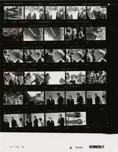 | Keywords: Ford A2048 NLGRF photo contact sheet (1974-11-19)(Gerald Ford Library).jpg White House Photographic Office WHPO is housed at the Gerald R Ford Presidential Library a branch of the National Archives and Records Administration NARA <br/><br/> This file is a 200 dpi photo contact sheet having images from roll of film A2048 of the August 9 1974 - January 20 1977 Gerald R Ford White House Photographic Office Series A0001-A9999 and B0001-B2886 photographs <br/><br/> The date on the photo contact sheet is the date the roll of film was processed not necessarily the date the photographs were taken See table below for additional details 1974-11-19 Gerald R Ford Presidential Library Image http //www fordlibrarymuseum gov/library/whphotos/A2048_NLGRF jpg A2048_NLGRF jpg from http //www fordlibrarymuseum gov/library/whphotos/19741119whpo pdf White House Photographs November 19 1974 of the http //www fordlibrarymuseum gov/Library/whphotos/whpo asp White House Photographic Collection page White House Photographic Office WHPO <br/> Creator David Hume Kennerly PD-USGov Institution Institution Gerald R Ford Presidential Library Table wikitable sortable + Photo contact sheet A2048 U S President Ford Administration Gerald R Ford Library Frame s Tone Subject proper Subject generic Names Geographic Location Photographer Date - 3 BW Trip to Japan - 1st Visit to Japan by Sitting U S President - Arrival Ceremony -U S Ambassador to Japan - Local Time returning to starting point following inspection of Honor Guard; formal wear GRF Amb James Hodgson Tokyo Japan Akasaka Palace Kennerly 1974-11-19 - 4-6 BW Trip to Japan - 1st Visit to Japan by Sitting U S President - Arrival Ceremony with Emperor of Japan - Local Time greeting handshaking; formal wear GRF Hirohito Kissinger Tokyo Japan Akasaka Palace Kennerly 1974-11-19 - 7-10 BW Trip to Japan - 1st Visit to Japan by Sitting U S President - Arrival Ceremony - Local Time greeting handshaking; formal wear GRF Japanese Officials Tokyo Japan Akasaka Palace Kennerly 1974-11-19 - 11 BW Trip to Japan - 1st Visit to Japan by Sitting U S President - Arrival Ceremony - Local Time greeting handshaking; formal wear GRF Unidentified Men Tokyo Japan Akasaka Palace Kennerly 1974-11-19 - 12-17 BW Trip to Japan - 1st Visit to Japan by Sitting U S President - Arrival Ceremony -Emperor of Japan - Local Time standing -informal portrait s ; formal wear Hirohito Tokyo Japan Akasaka Palace Kennerly 1974-11-19 - 18-21 BW Trip to Japan - 1st Visit to Japan by Sitting U S President - Arrival Ceremony -Emperor of Japan - Local Time standing talking - interpreter not in every frame; formal wear GRF Hirohito Interpreter Tokyo Japan Akasaka Palace Kennerly 1974-11-19 - 22-23 BW Trip to Japan - 1st Visit to Japan by Sitting U S President - Motorcade to Imperial Palace - Local Time waving flags clapping; formal wear Crowd Tokyo Japan Street Scene Kennerly 1974-11-19 - 24 BW Trip to Japan - 1st Visit to Japan by Sitting U S President - Motorcade to Imperial Palace - Local Time driving up incline limousines Tokyo Japan Street Scene Kennerly 1974-11-19 - 25-26 BW Trip to Japan - 1st Visit to Japan by Sitting U S President - Visit to Imperial Palace - Emperor of Japan - Local Time standing posing smiling; formal wear GRF Hirohito Tokyo Japan Imperial Palace - Takeno-ma Kennerly 1974-11-19 - 27-29 BW Trip to Japan - 1st Visit to Japan by Sitting U S President - Visit to Imperial Palace - Emperor and Empress of Japan - Local Time standing posing smiling; formal wear GRF Hirohito Nagako Tokyo Japan Imperial Palace - Takeno-ma Kennerly 1974-11-19 - 30-31 BW Trip to Japan - 1st Visit to Japan by Sitting U S President - Visit to Imperial Palace - Emperor and Empress of Japan - Local Time standing posing; formal wear; formal wear GRF Hirohito Tokyo Japan Imperial Palace - Takeno-ma Kennerly 1974-11-19 Gerald R Ford Presidential Library and Museum-cooperation PD-USGov Contact sheets by the Ford White House November 1974 Photographs by David Hume Kennerly from 1974 |